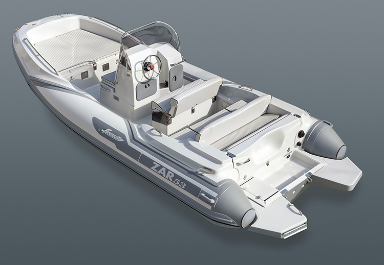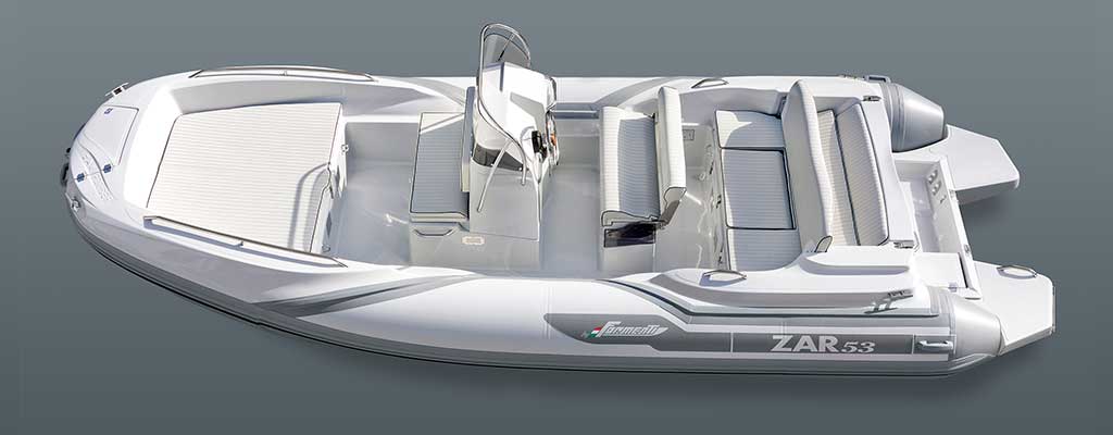Same features of the classic ZAR 47 improved with white/grey carbon style cushions upholstery, sport driving wheel, n° 3 bow backrest cushions