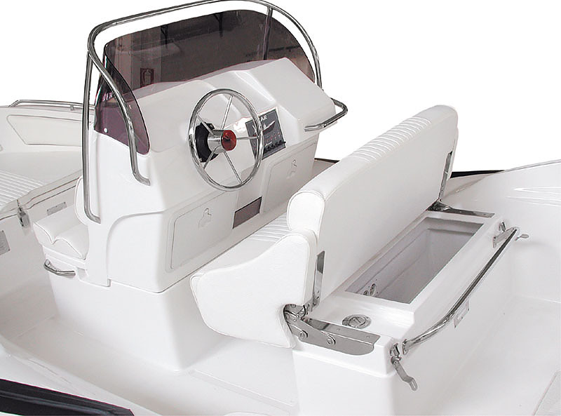 Complete with VTR two-seater drive console with front seat for two and peak, rudder and handrail of stainless steel, hydraulic steering, windshield, one indoor compartment, n 2 doors, anatomic seat cushion and seat back for front console seat; anatomic driver’s seat for two permitting driving in a semi-seated position; stainless steel ladder with 2 dashboards on VTR; 4 bollards, 5 stainless steel handles, 4 rubbon handless, 2 stainless steel grab rods in prow; stainless steel anchor winch nose with stainless steel shield; 7 kg stainless steel anchor; gas springs for afterpeak and forepeak covers; prow cushion; stern cushion; stern headrest cushion; padded stern backrest which may also be used to extend stern sun bed; 3 headrest cushions for prow; tank of about 200 lt. installable in accordance with EC regulations; repair kit; inflation pump; pressure gauge, paddle oars. (All cushions are made of closed cell expanded polyurethane.)