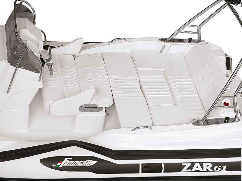 Same features of the classic ZAR 61 improved with white/grey carbon style cushions upholstery, sport driving wheel, swim platforms, switch panel.